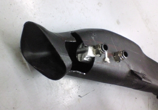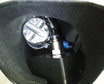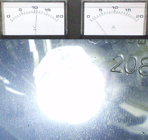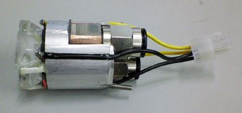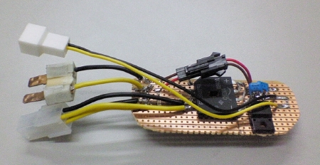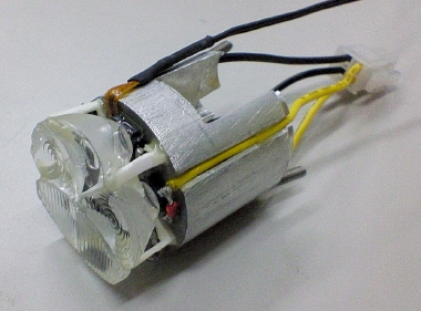 総電力17.5W(ひとつあたり約3.5V、1Aでドライブ)である。 LEDの仕様では1.5Aまで通電可能なので、かなりのアンダードライブとなる。これは、そこまで容量のあるコンパクトな定電流回路が見つからなかったため。 上3つと、下2つは別回路で駆動する。アイドリング時は供給電圧が8V程度になるので、たぶん下2つしか点灯しない。 先日つくったレンズを装着。 上についているコードは温度センサー。 さらに水冷ブロックを装着。 ライトユニットに組み込んで点灯させてみる。 通水しなくてもライトヘッドの熱容量が大きいので、数分なら点灯可能。 この後ひと通り水冷系も組み立てて通水したら、自作ラジエターのフィッティング接続部から漏水したので、ここも接着樹脂で固めることにした。