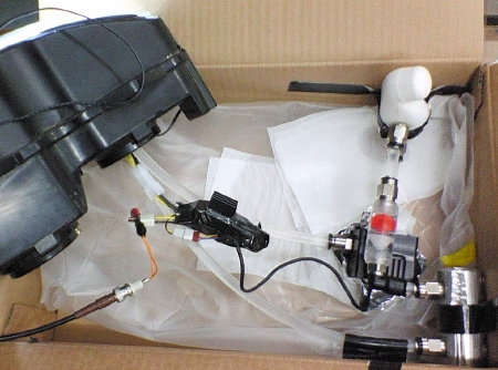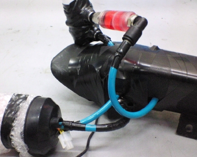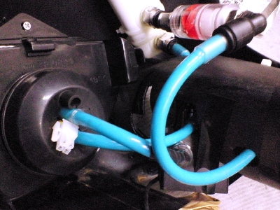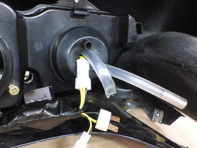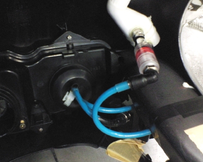 下の写真がテスト環境。とりあえず、ダンボール箱の中に収めた。 左側がヘッドランプユニット、その右にコードでつながっている黒いのが電源で、防水テープで包んである。ヘッドランプユニットは実車のではなく中古で手に入れた予備パーツ。 右側が水冷系で、上の白いのがリザーバー、下の金属円筒がラジエター、その間の黒い四角いのがポンプで、重なっている透明プラスチックの円筒がフィルター&流水確認用水車。 全体の配置は実際に搭載したときの位置関係に近付けている。 水冷系を別角度から。パーツの固定はかなり適当である。 電圧が7Vで下側の2つのLEDが点灯しはじめる。8.5Vでポンプが動きはじめる。一旦動くと6Vまでは下げても止まらない。 11Vで上側の3つのLEDも点灯しはじめる。一応定格の12Vでは電流が1.5Aで消費電力は18Wになった。14Vくらいまでは明るさが増していき、消費電力は30W程度まで上がった。 温度センサーを水枕とライトヘッドの間に挟み込んで温度を計った。 点灯テスト開始前に20℃→13Vの電圧で30分後に37℃になった。 冷却性能は申し分ない(少なくとも冬期は)。 それより電源ユニットの発熱が思ったより多いので、風通しのよい場所に設置する必要がある。 今回のテストで特に問題はなかったので、いよいよ実車に搭載する作業に入る。