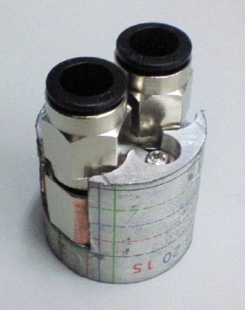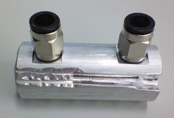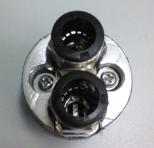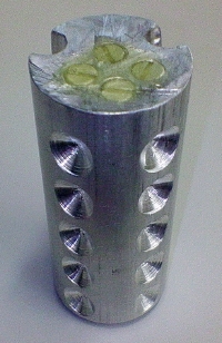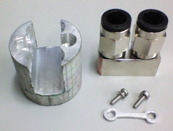 当然、エンジン用ではなく水冷LED用のものである。 市販品のラジエターを用意していたが、サイズが大きくて取り付けに難があったので自作した。 ライト部分の製作で余ったΦ36mmのアルミ円柱を使った。 見た目はこんな感じでラジエターっぽくない。 手前の2つの穴が冷却水の出入口で、中で4つの穴につながっている。 出入口から覗き込むと、中でつながっているのが見える。 4つの穴をふさいだ後。 表面の凹凸は、多少の放熱効果を期待してつけてみた。 チューブとのコネクタをつけた一応の完成形。 大部分が金属の塊なので熱容量は大きそうだが、ある程度温度が上昇した後の放熱性能は低いと思われる。 とりあえず試してみて、ダメなら既製品を使う予定。 PR
